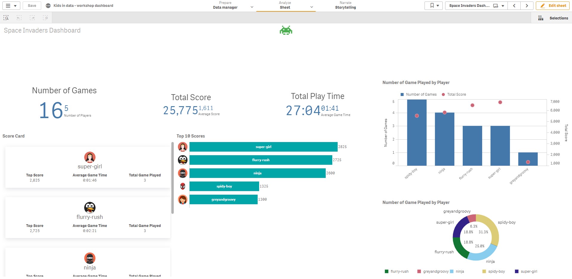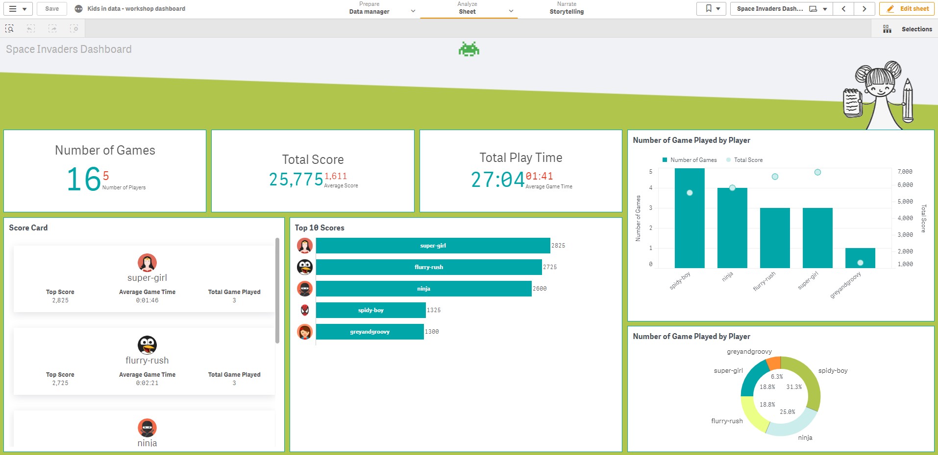 I needed a new theme for my Kids in Data dashboard. So I decided to put my winnings to work! Once I logged in – the only difference I noticed was a new “My Themes” button. I guessed this is where my saved themes would end up eventually. I decided to start a fresh theme. Upon going to the theme editor, I noticed the “Save Theme” button is now available. I went about creating my colour palette and customising the theme with KiD branding colours. I exported the theme and tried it on my QSD, the result was as expected. I then wanted to modify the CSS to set background colour, border and hover over effects to the Qlik Sense objects. I already had the CSS in one of my old themes, I modified it slightly and added that to the Theme editor. Then it was simply the matter of exporting and installing the theme on the server and you can see the final outcome below!